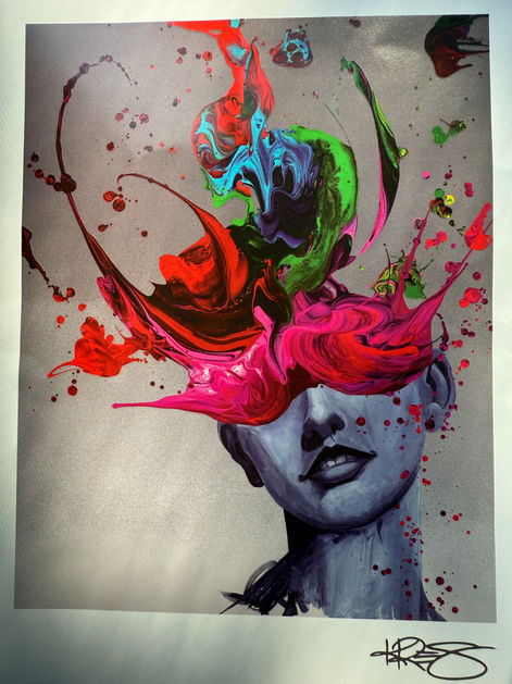 From rooftops and train yards to tattoo studios in Florida and New York, he honed his craft across subcultures and mediums, developing a discipline in composition, anatomy, and color that now infuses his fine art. In 2017, Kre8 left tattooing to pursue painting full‑time, and his breakthrough came at Art Basel Miami the following year. His signature style, known as Kre8tizm, fuses surrealism, abstraction, and street art energy into works rich with symbolism and emotional storytelling. Stylized faces, light bulbs, and fragmented forms recur as visual metaphors for insight, resilience, and transformation. From graffiti walls to gallery spaces, Kre8’s art stands as a testament to reinvention and the power of creative evolution.